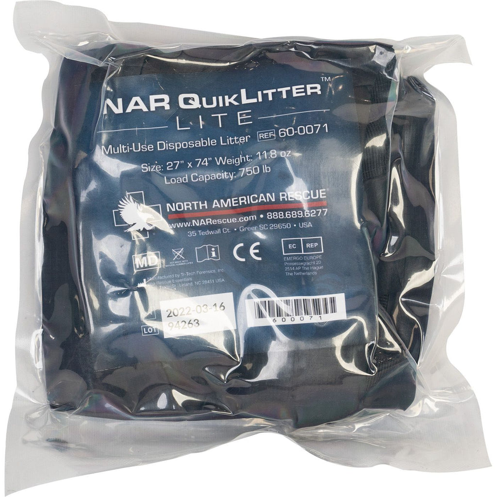 Expanding on the success and feedback from the QuikLitter™ and QuikLitter™ XL, North American Rescue's QuikLitter™ Lite has added capability and reduced weight and size to be able to fit into a cargo pocket. The QuikLitter™ Lite is an emergency carry litter that is designed for rapid deployment for the movement of casualties for mass casualty incidents, disasters, active shooter events, as well as for everyday patient movements. Constructed of a lightweight nylon material with heavy-duty nylon webbing, the NAR QuikLitter™ Lite is rated to 750 lb. and is latex free. It features ten (10) carry handles with four (4) on each side and one (1) larger handle at either end of the litter to provide multiple carry points.